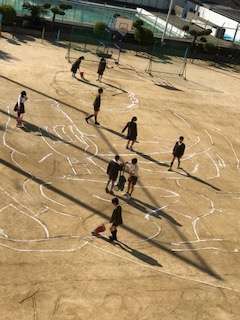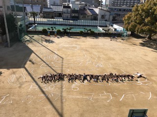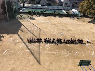 白線で、午前中に作成した運動場の線をなぞる6年生。立派な大仏様が完成しました。算数科「拡大と縮小」の学習内容を体験を通して応用へと発展させていたのです。算数の学習だけでなく、卒業に向けて、また一つ仲間との貴重な思い出を作りました。最後は、描いた大仏様と記念写真です。太陽も輝き、みんなを照らしながら、未来を応援しているようです。