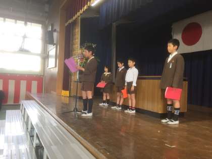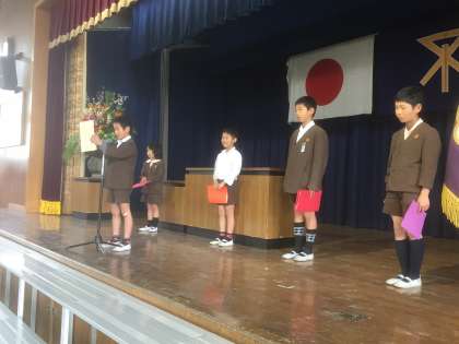 修了式では、各学年の代表が、3学期に頑張ったことや、春休みのめあてを全校児童の前で
