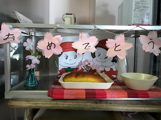 4月の給食室のサンプルケースとメニューボードです。かわいらしい1年生と桜のおめでとうが、ケースを飾り、給食のおいしさを伝えています。給食調理員さんは、お料理だけでなく、絵や飾りづくりも上手です。
