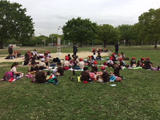 その後、芝生広場で昼食。色とりどりのお弁当を美味しそうに食べていました。食後はおやつタイム&遊びタイム。友達と交換して食べたり、広い広場を所狭しと走り回って楽しく体を動かしたりしました。