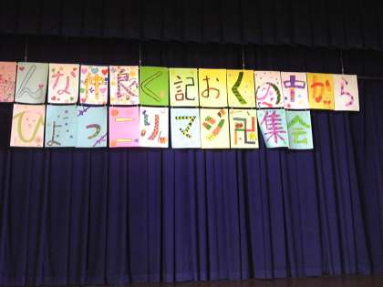 昨日は、集会参観、PTA予算総会にご参加頂きありがとうございました。下の写真は、集会参観の舞台上のタイトル掲示です。健康委員会の子どもたちが作ってくれました。それぞれ全く違った個性的な文字がつながって響き合い、何とも素敵な看板になっています。この看板のように、子ども一人一人の個性が輝きつつ、集団としてのハーモニーを奏でる、そんな学級、学校をつくっていきたいと思います。