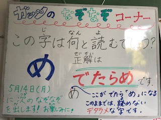 職員室横の校長先生コーナー、先日から、子ども達はじめたくさんの人が答えを考えていた「なぞなぞ」の答えが、発表されました。答えは…「で・た・ら・め」でした。みなさん、いかがでしたか??次回は、どんな問題か楽しみです。答えがわかったら、いざ、校長室へ!