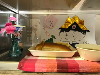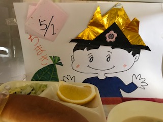 給食メニューボードとサンプルケースの全景です。五月らしい雰囲気で、楽しく飾られています。毎月、子ども達は楽しみにしています。