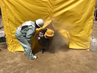 火事での煙が、いかに逃げ道を阻むかを、体験。高学年でも、視界ゼロの体験に、真剣に出口を探す姿がありました。