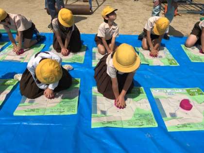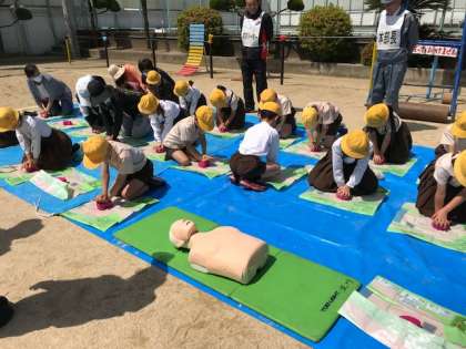 いざという時には、子どもでも心肺蘇生法で命を守れるように、心臓マッサージの体験です。コツを教えてもらって、上手に取り組んでいます。