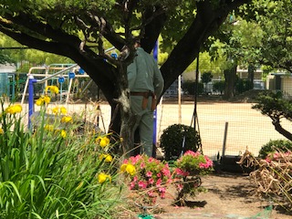 緑が輝き、気持ちのよい季節ですが、管理作業員さんは、環境整備に大変です。葉っぱの掃除、木や草の剪定、そして、害虫の予防や駆除。その他にも、たくさんの役割を果たしています。子ども達の安全と安心を守り、木川南小学校をよりよくするため、管理作業員さんは、がんばっています!