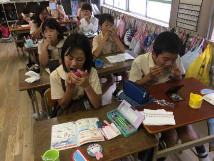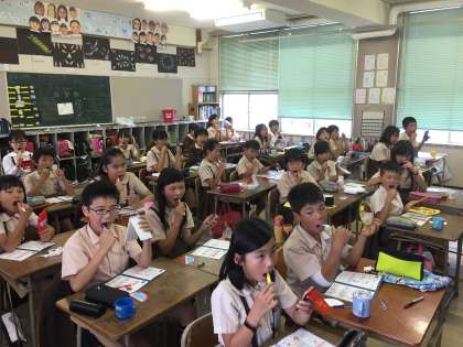 子ども達に、新しい歯ブラシとデンタルフロスを渡したので、今日の学習を生かして、健康な歯を維持してもらいたいと思います。