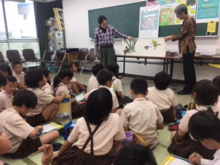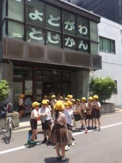 到着して通された部屋は冷房が効いていて、子どもたちは大喜び。まずは、「なにわんとぶっくん」という紙芝居で、図書館のことについて教えてもらいました。次に、自分たちが疑問に思っていることについて質問し、答えてもらいました。その後、「おおきなかぶ」の大型絵本の読み聞かせをしてもらいました。1年生のころ、国語で学習したことを思い出しているようでした。