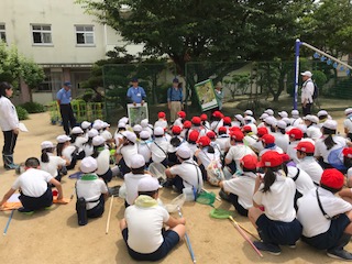 十三干潟に向けて、今から出発します。淀川レンジャー隊の方々はじめ、区のセーフティー淀川のスタッフの方々にも付き添っていただきます。子ども達はワクワク楽しみにしています。さて、どんな生き物が観察できるでしょうか?