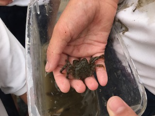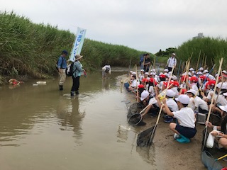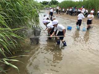 3年生から5年生が淀川の干潟探検に行きました。子どもたちは、干潟にすむ生き物を捕まえようと、夢中で活動をしていました。カニやエビ、ボラなどの魚を見つけたときは、大喜びでした。また、よしの葉で、笹舟や草笛を作って遊ぶ子もいました。