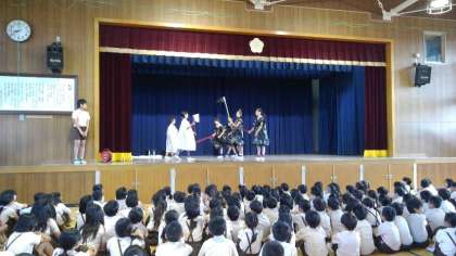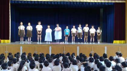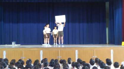 ハミガキマンvsバイキン大王の劇と歯のクイズと健康の秘訣について発表しました。おかしが大好きなこうくんの口の中ではバイキンマンたちがむしばをつくろうと大暴れ!ハミガキマンが登場してやっつけてくれました。よい歯でよくかみよいからだ。歯のクイズで歯のことについていっしょに考えました。