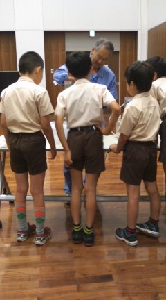 雨のため始めに、会議室で、班に別れて、汚水を砂や活性炭を使い、透明な水にする体験学習をしました。