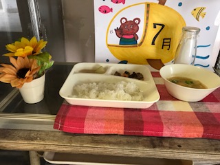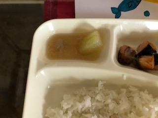 今日の給食には冬瓜がつきました。味噌汁に鮭の焼き物と純和風。さてこの冬瓜、今回巨大で、一つで全校分だったそうです。その大きさは?