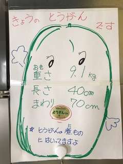 重さ9キロ以上ある、おおきな冬瓜でした。給食調理員さんが、早速、絵にして紹介しています。