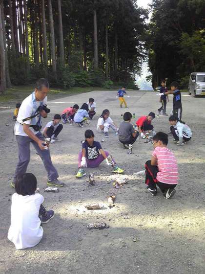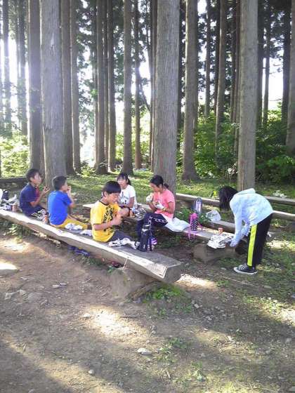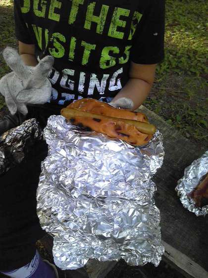 みんな元気に、自分達で作ったホットドッグを食べています。美味しい!