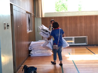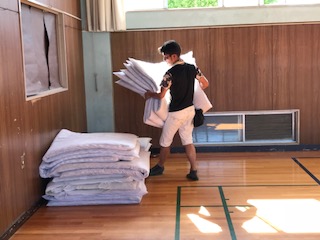 講堂で、今晩6年生が泊まります。布団の運び込みも完了です。