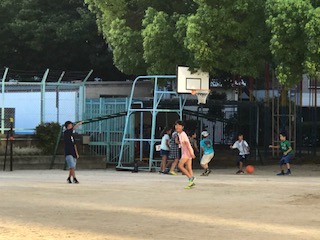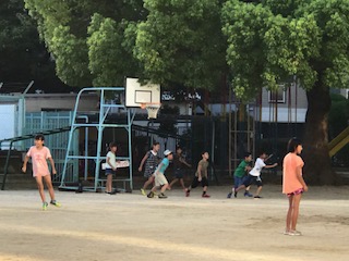 元気いっぱい運動場で遊んで待つ子ども達もいます。暑いけれど、とても元気。普段、こんな時刻まで遊べないので、この機会に思う存分楽しんでいます。