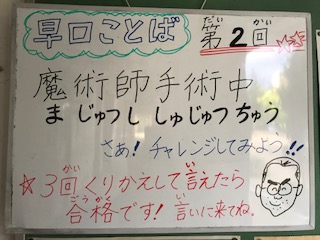 今週の早口言葉のお題です。なかなか、難しいです。が、みんな頑張っています。みなさん、3回言えましたか?