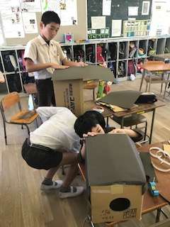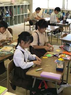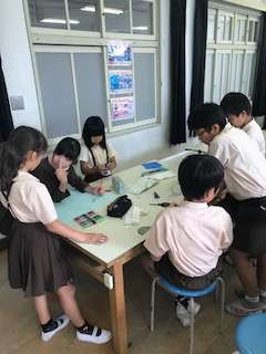秋の集会の遊びの準備がいよいよ始まりました。班で協力をして看板や景品を作ったり、ルール説明を考えたりしています。高学年がリードをし、低学年に優しくつくり方を教えていました。