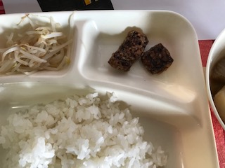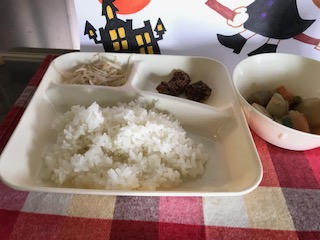 今日の献立では、一年に一度のクジラを使ったメニューです。生姜醤油のたつたあげ。子ども達も大好きです。