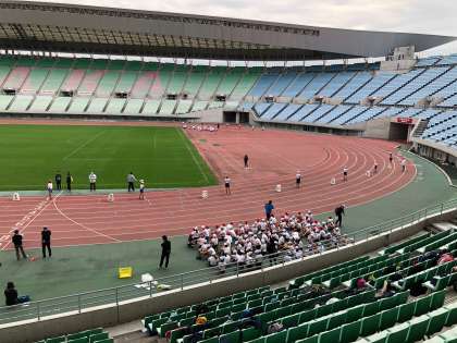 6年生は、長居陸上競技場でスポーツ交歓会を行なっています。これから、リレーが始まります。