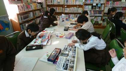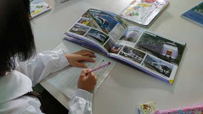 今日は図書室に行って、乗り物の本を選んで、乗り物について調べ学習をしました。