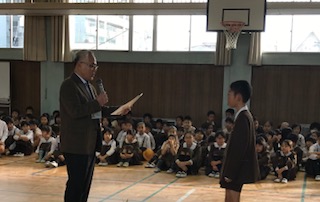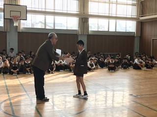 2年生から返還されたガッツ賞は、11月スポーツ交歓会でチームワークや練習の成果を発揮した6年生へと授与されました。12月は何年生になるのか、子どもたちのがんばりが楽しみです。