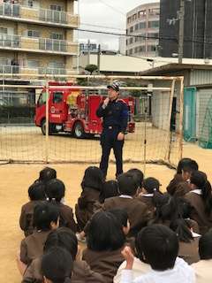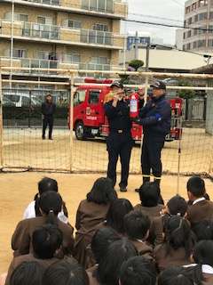 火災避難訓練を全校で行いました。ハンカチで口を押さえて、しゃべらず、素早く避難することができました。消防署の方から、避難する時の注意や心得、消化器の使い方を教えていただきました。この機会にもう一度、ご家庭で防災についてお話をしていただけたらと思います。
