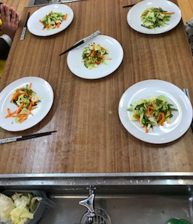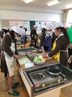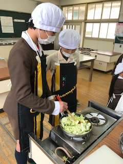 6年生が調理実習で野菜炒めをつくりました。野菜はせん切りや短冊切りにしました。炒める時は、強火で短時間で炒め、美味しい野菜炒めをつくりました。最後まで手際よく班で協力して調理実習ができました。