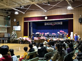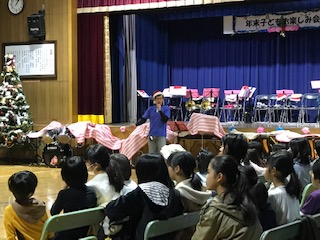 子ども達が楽しみにしている、年末お楽しみ会がはじまりました。会場はウキウキ、ワクワクです。会場での注意も聞いた後、いよいよ、大イベントの始まりです!