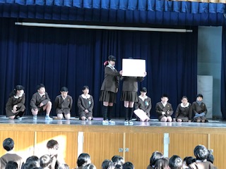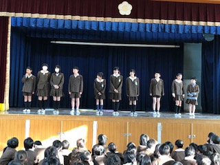 児童集会で、給食委員会の子たちが、栄養のバランスなどについて楽しいクイズをしました。また、今週は給食週間だったということで、それぞれのクラスで作ったお手紙などをいつも美味しい給食を作ってくださっている調理員さんたちにわたしました。