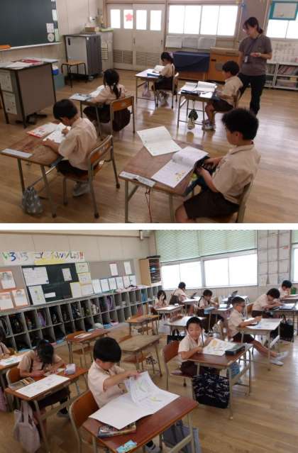 お邪魔したクラスのほとんどが国語の授業中でした。でも、学年によって取り組み方に違いがあって、見ていて面白いです。児童のみなさんも「テストいや〜!」とか言いながらも、なんだかんだでちゃんとがんばってくれています。みんないいね〜!