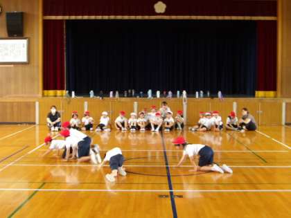 今日の1,2年生の体育は、2,3限を使って表現遊びに取り組んでいます。それぞれの班がウサギやイヌなどになりきって、自分たちで考えたストーリーを発表します。子どもたちの想像力がより高められるだけでなく、低い位置で身体を動かすことによって良い運動にもなっているようです。発表を見る周りのみなさんも思わずはいりこんでしまうほど、どの班も上手に発表していて、とても面白いです。いいね〜!