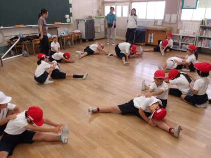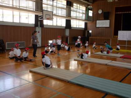 今日の2限は1,2年生が合同で体育に取り組んでいます。ケガを防止するため、まずは教室で体操や二人一組で柔軟を行いました。講堂では後ろ回りのはじめの段階として、「後ろにコロンと回って、また元に戻ってみよう」と説明があり、みんなでチャレンジです。元に戻るときに「おしりが浮いてるかな?」とのチェックもあってなかなか厳しいようですが、楽チンな人が多いようですね。さて、無事に後ろ回りができるようになるのでしょうか?がんばれ〜!