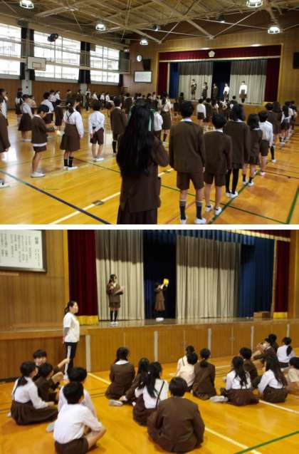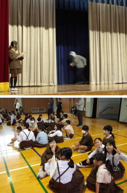 今朝の児童集会では、はじめにゲームを行いました。「幕の間を通るのは何でしょう?」ということで、ボールやふで箱などが通りました。みなさんよく見ることができていて、たくさんの班が正解していました。でも、さすがに先生は難しかったです!