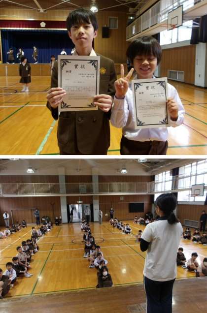 つづいて、校長先生から大阪府学生科学賞で銅賞を受賞した人の紹介と、教育実習の先生が今週いっぱいで実習を終えますというお話がありました。また、教育実習の先生からは、「これから大変なこともあると思いますが、みなさんの明るさで乗り越えてください」というご挨拶がありました。どちらのお話でも自然と拍手をしてくれていて、みなさんの優しさを感じました。いいね〜!
