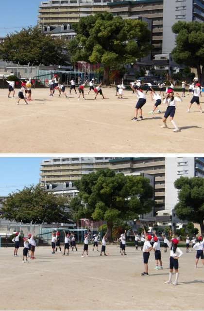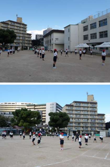 今日の4限は、1〜4年生のみなさんがグラウンドに出て運動会の団体演技の練習をしています。演技はもちろんですが、入場や退場といったところもしっかりと確認していきます。雲が流れて日が陰ると少しヒヤッとしますが、真剣な表情で取り組んでいる児童のみなさんの熱いやる気がひしひしと伝わってきます。いいね〜!