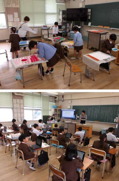画像(上)1年生 図工 きれいな花の背景を描こう