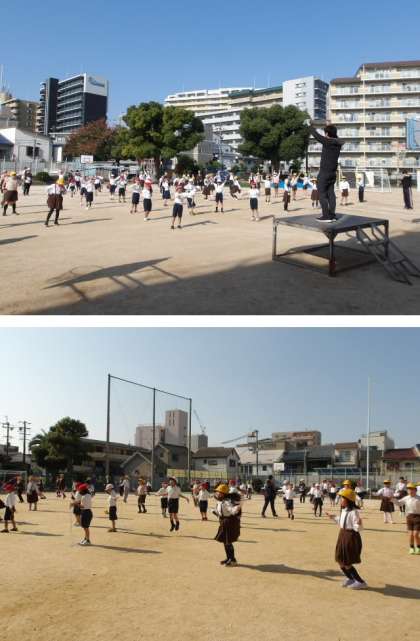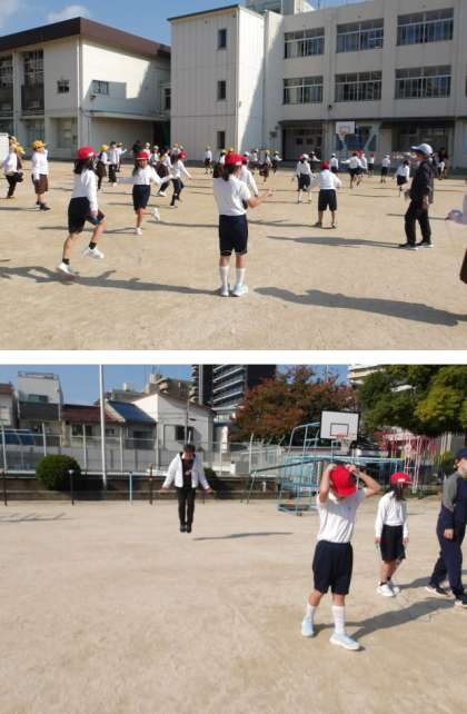 今日も元気になわとび運動です。久しぶりに6学年がそろいました!ぽかぽか陽射しが暖かいので、飛んでいると身体が温まって上着を脱ぐ人がいっぱいいました。やっぱり運動するのは健康に良いですね〜。児童のみなさんの後ろで、校長先生もこっそり練習しています。