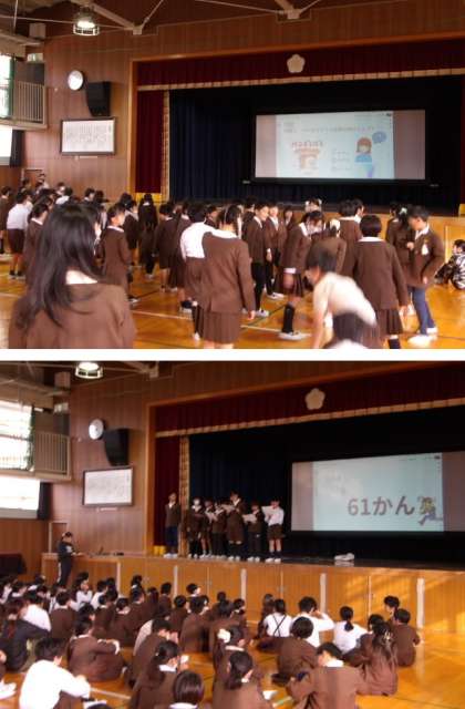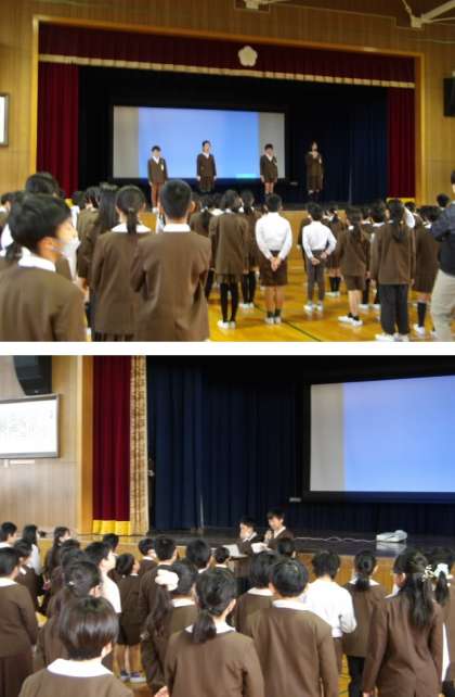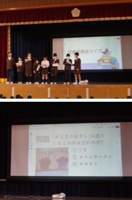 今朝の児童集会は、図書委員のみなさんが考えてくれた図書クイズを行いました。いろいろな絵本をもとに三択問題が出て、朝から盛り上がりました!また、計画委員のみなさんからは「赤い羽根共同募金」についてお話がありました。どちらの委員のみなさんもありがとう!いいね〜!