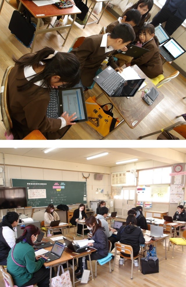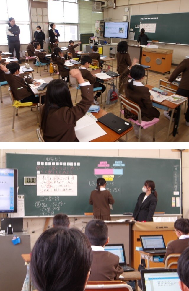 今日の3限は、先ほどの4年生に引き続き、5年生の算数の授業を教育委員会のスクールアドバイザーの先生が見に来ています。5年生の皆さんは、前の授業の続きで、百分率を電卓で計算したあとタブレットを使って帯グラフと円グラフを作成しながら、調査結果をさらに分析することを学びました。また、その後は、スクールアドバイザーの先生から指導助言をいただき、充実した研修となりました。4,5年生どちらの学年も、普段からタブレットのデジタル教科書などを良く使っており、スクールアドバイザーの先生からお褒めの言葉をいただきました。児童の皆さんと一緒に先生方も成長しているのは、いいね~!