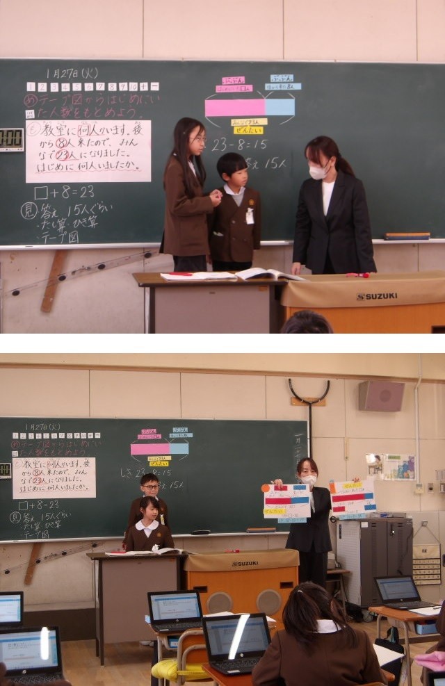今日の5限は、2年生の算数の授業をたくさんの先生方が見に来ています。また、大阪市総合教育センターからスクールアドバイザーと指導主事にもお越しいただいています。2年生のみなさんは、テープ図を用いて足し算と引き算をどのようなときに使えばよいのかを学びました。また、放課後の討議では、先生方からの意見や質問のほかに、指導主事から指導助言をいただき、とても充実した研修となりました。