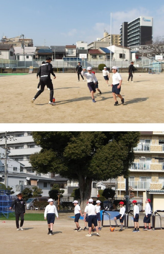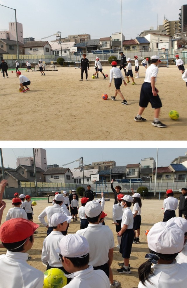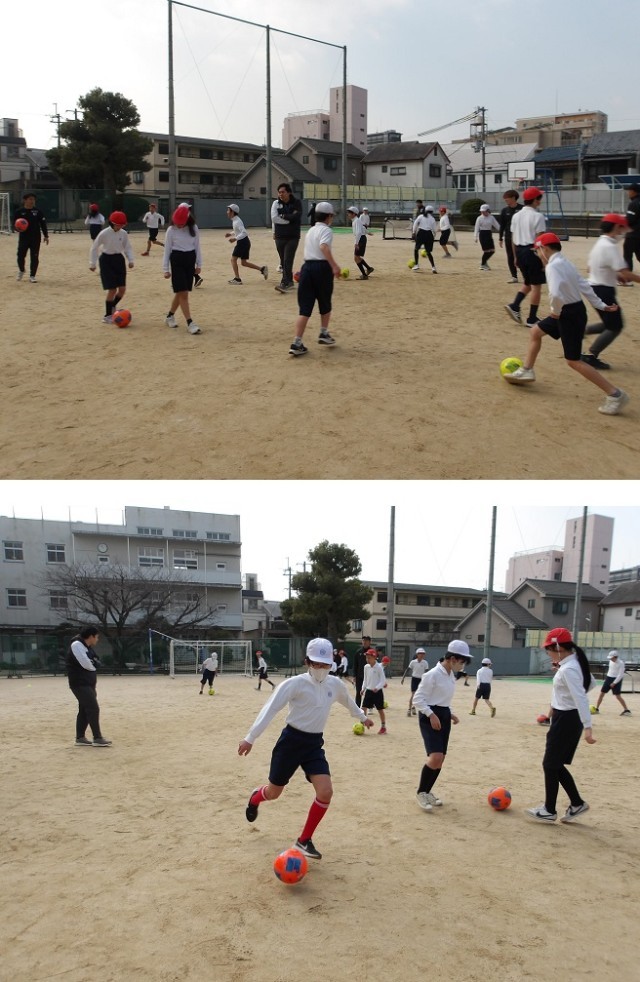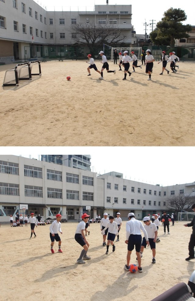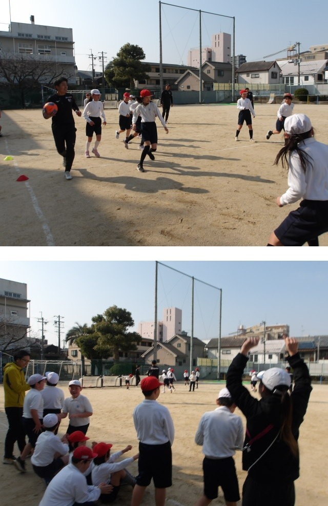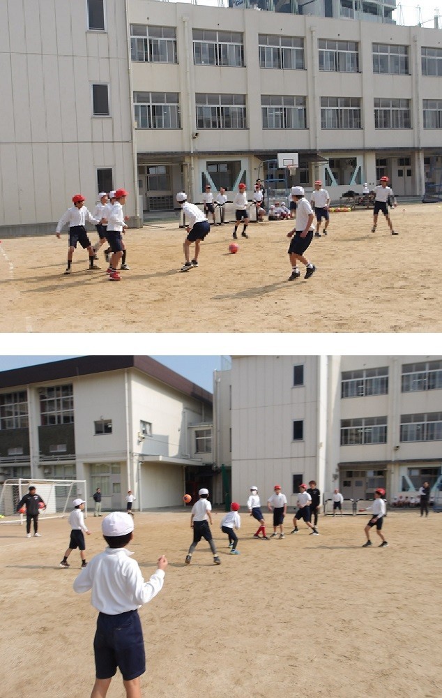 2限は3,4年生の皆さんと一緒に、サッカーの楽しさを教えていただくとともに、チームワークや周りを見て判断することを教えていただきました。