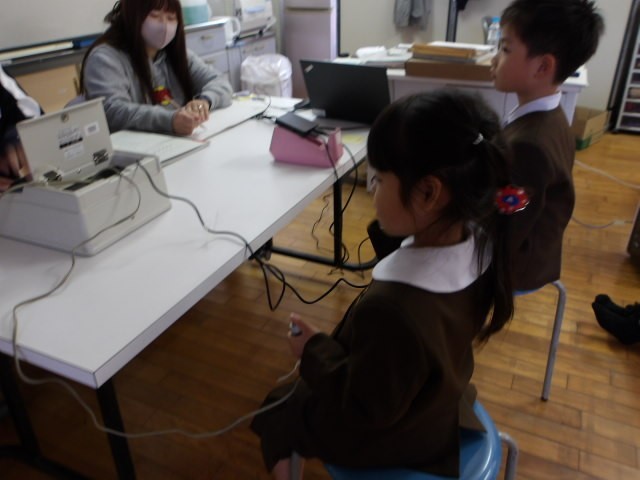 今日は1~3年生の皆さんの聴力検査を実施します。「音が鳴っているあいだは、ボタンを押してください」という保健室の先生のお話を、皆さん真剣に聞いています。実際の検査では「なんかピーッて鳴ってる」とのこと。しっかり聞こえているようで、いいね~!