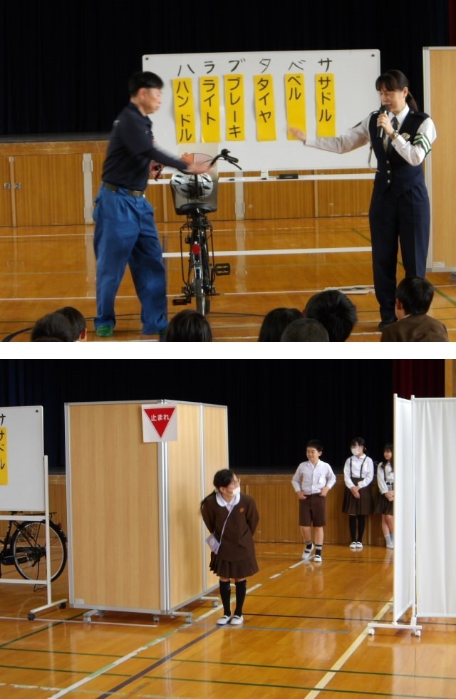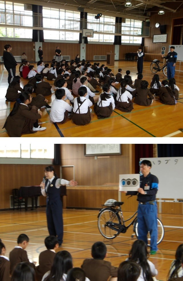 今日の2限は、淀川警察署とセーフティ淀川の皆さまにお越しいただき、交通安全指導を実施しました。はじめに信号や道路標識についてお話があり、続いて自転車の点検「ハラブタベサ」について説明をしていただきました。最後は、安全に通行するためのルールを実際に体験しながら確認することで、新しくなった道路交通法やじぶんの身を守る方法についてしっかり学ぶことができました。ありがとうございました!