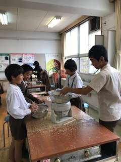 5年生が春に田植えをし育ててきたお米を、今日は脱穀しました。扇風機でもみ殻をとばしていきました。木川南産のお米を精米し、美味しく炊くのが楽しみです。