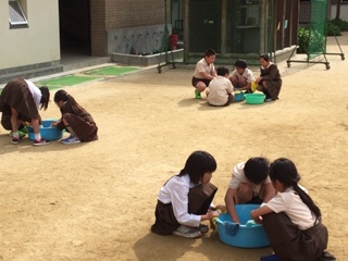 社会科で昔の暮らしについて学習しています。その中で、洗濯板を使ってみようということ学習があり、みんなで軍手をきれいにすることにしました。石鹸でアワアワ。洗濯板でゴシゴシ。水でジャブジャブ。たくさんの軍手がきれいになりました。
