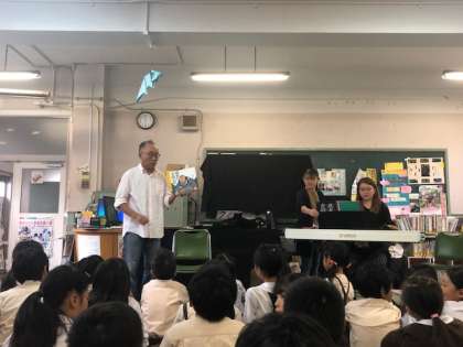 1・2年生では「そらからかいじゅうがふってきた」、3・4年生では「ピオポのバスりょこう」、5・6年生では「ミカちゃんのひだりて」を、電子ピアノの生演奏に合わせて、くすくすさんが読んだあと、原画を見せながらその絵本ができるまでのお話を中川さんがしてくださいました。また、絵本作家になるまでのお話などご本人でなければできないお話もいっぱいしてくださいました。子どもたちは、絵本の世界に引き込まれ、夢中になって聴き入っていました。秋の読書週間です。たくさんの本にふれあい、自分の世界を広げてほしいと思います。 -