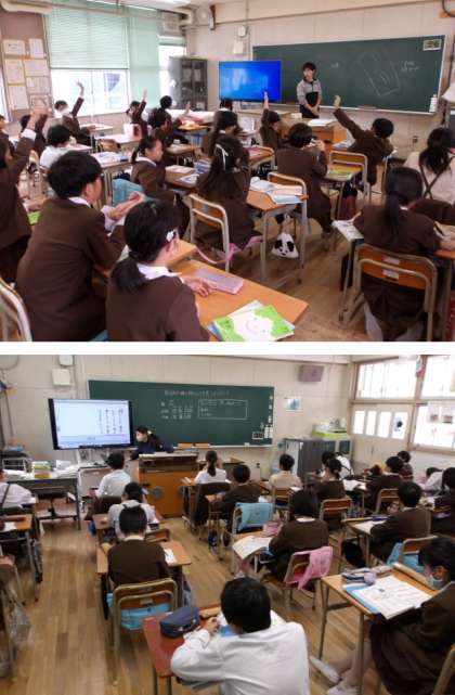 6年生は算数ドリルに取り組んでいて、先生のチェックで全部OKの人はタブレットで『寿司打』に挑戦しています。校長先生があとでやってみたところ、「お手軽3,000円コース(普通)」で1,380円分お得だったそうです。児童の皆さんのほうが上手かも知れませんね。5年生は「詩と音楽を味わおう」ということで、この時間は北原白秋の『この道』を合唱や重唱など、いろいろな歌い方で聞いて、音の重なりをどのように感じるのかプリントに書き込みます。どちらの学年も積極的に取り組んでいて、いいね〜!