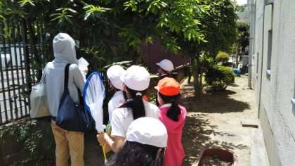 6月26日(金)に大阪環境局から「いきものさがし」の出前授業に来ていただきました。4年生が4つの班に分かれ、学習園や築山、校舎の裏などでいきものを探しました。バッタやチョウなどは時々見かけるのですが、そんなにたくさんのいきものがいるようには思えません。しかし、普段は見過ごしていたり、見えていても全く気にもとめていないような小さな虫たちがたくさんいることに気が付きました。